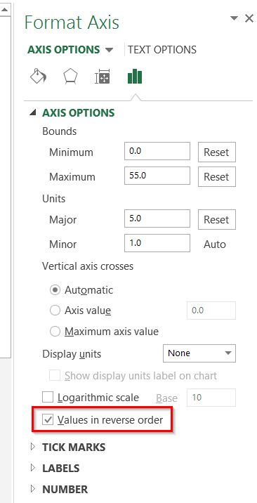 Pour débuter, reprenez du début les étapes d’élaboration du graphique en point de données. Ne conservez qu’un seul point de donnée dans votre graphique. Ensuite, inversez l’ordre des valeurs sur l’axe des x.