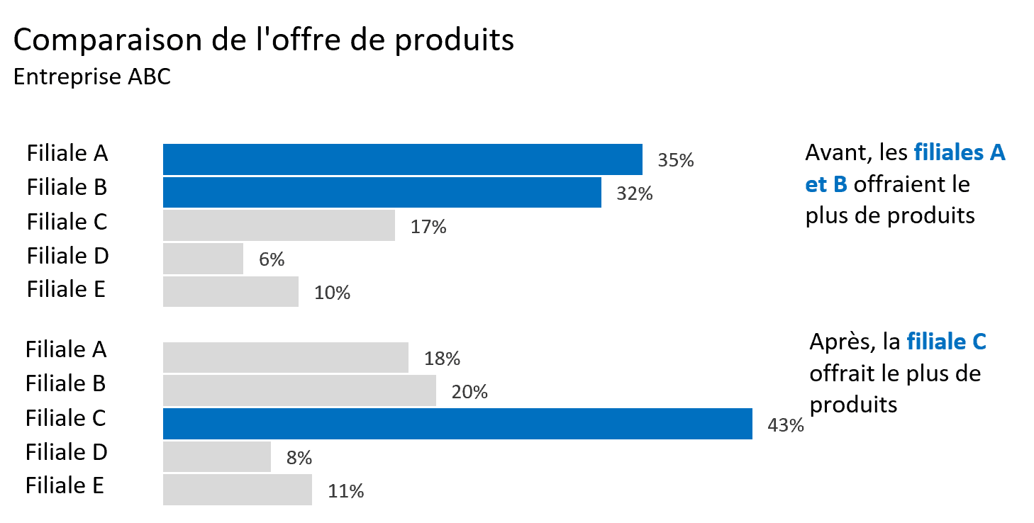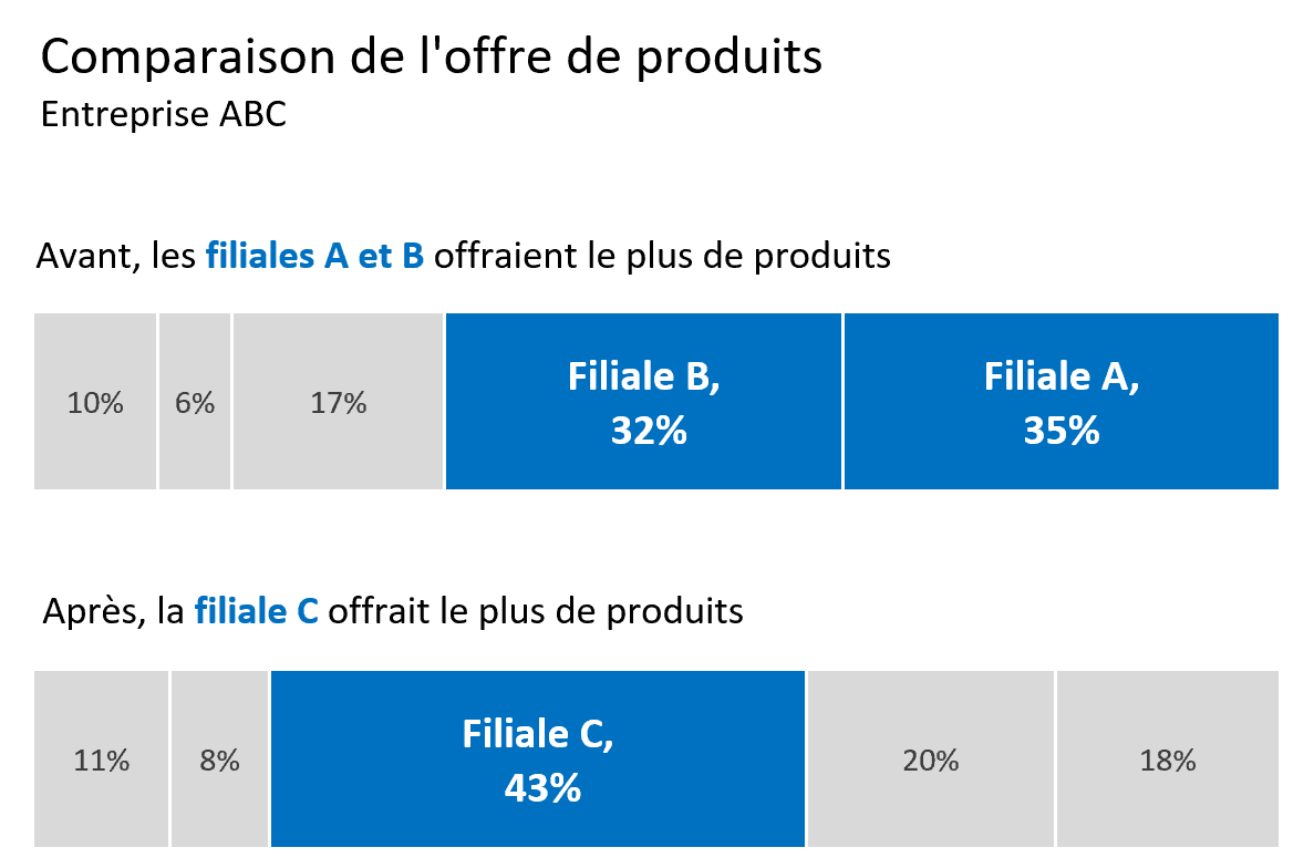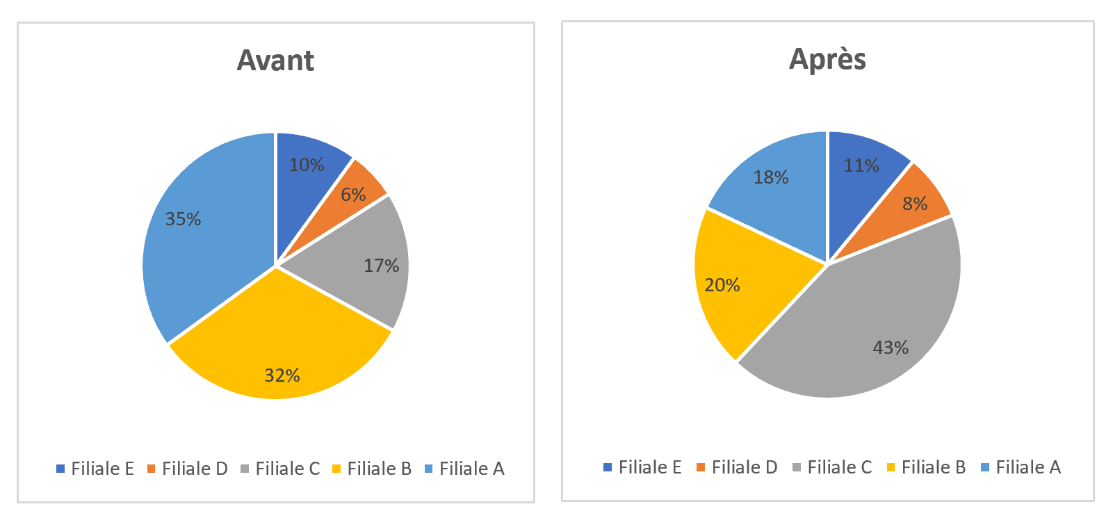 En examinant bien les données, on se rend compte qu’avant, les filiales A et B étaient les filiales qui offraient le plus de produits parmi les 5 filiales et qu’après, c’est la filiale C qui offrait le plus de produits parmi les 5 filiales.