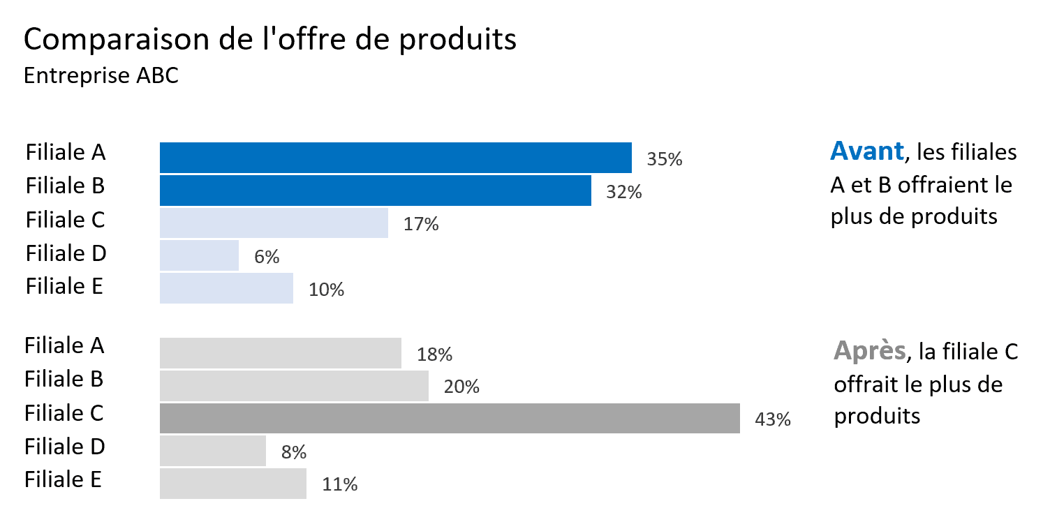 On aurait également pu présenter le tout en utilisant une couleur pour différencier les deux séries de données (ici le bleu et le gris) et simplement mettre en plus foncé les valeurs les plus importantes. Dans ce cas, les boîtes de texte devraient également suivre la même logique.