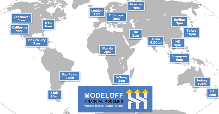 ModelOff est un concours international en modélisation financière et en est à sa 3ième édition. Le concours se déroule en 3 rondes. Les deux premières rondes consistent en un examen de 4 questions chacune, dont 3 à développement, que les participants réalisent en ligne. Ainsi, partout autour du monde, des adeptes de la modélisation financière se connectent, en même temps (donc à des heures locales différentes) et complètent les questions. Au Québec, cette année, nous avions la chance de participer au concours à une heure raisonnable (pour certains!), soit 8:00 am le samedi matin. Et Le CFO masqué s’est ainsi classé parmi les meilleurs en modélisation financière.