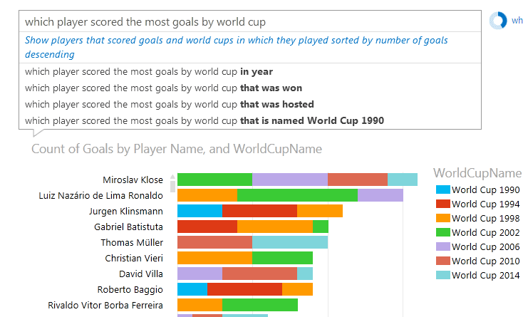 Le Q&A (Questions and Answers) est une des fonctionnalités de Power BI. Celle-ci permet aux usagers d’interroger les données de l’entreprise, à l’aide d’un moteur de recherche. Pour effectuer une recherche, l’usager posera carrément des questions, comme ça lui viendrait en langage naturel. Par exemple, ci-bas, l’individu demande quel joueur a marqué le plus de buts à la coupe du monde. Dès que c’est possible, le Q&A commence à renvoyer des résultats, sous forme de graphiques. Les questions peuvent ensuite se préciser pour obtenir de meilleurs résultats.