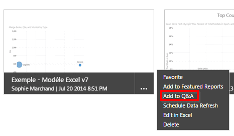 Évidemment, pour obtenir des réponses aux questions qui sont posées à travers le Q&A, les données sous-jacentes doivent exister. Ainsi, lorsqu’un usager importe un de ses modèles dans Power BI, il doit “l’ajouter” au Q&A, pour le rendre disponible dans le moteur de recherche.