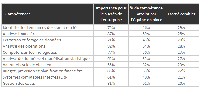 Or, selon un récent sondage réalisé par Robert Half et le Institute of Management Accountants (IMA), 90% des gestionnaires financiers affirment avoir de la difficulté à embaucher des analystes avec des compétences en B.A. (Business Analytics). Et voici la liste des compétences qui seraient recherchées par les entreprises, chez les analystes financiers et comptables, et qui semblent déficientes en grande partie: