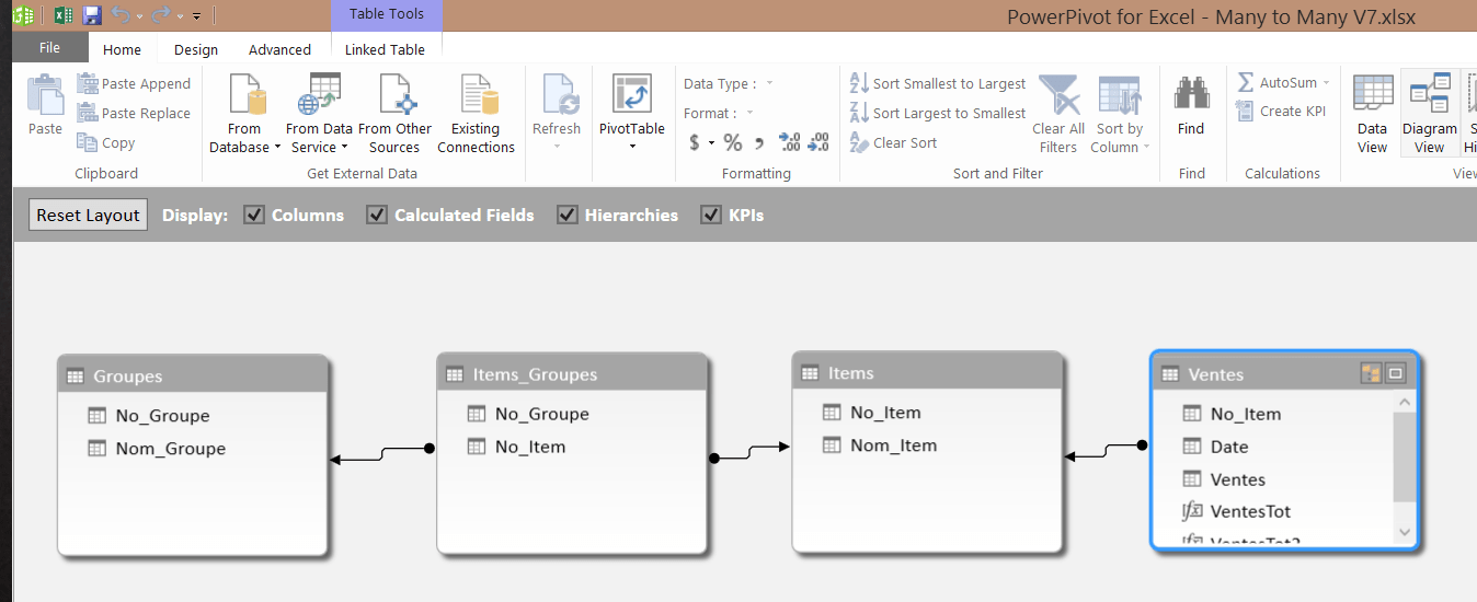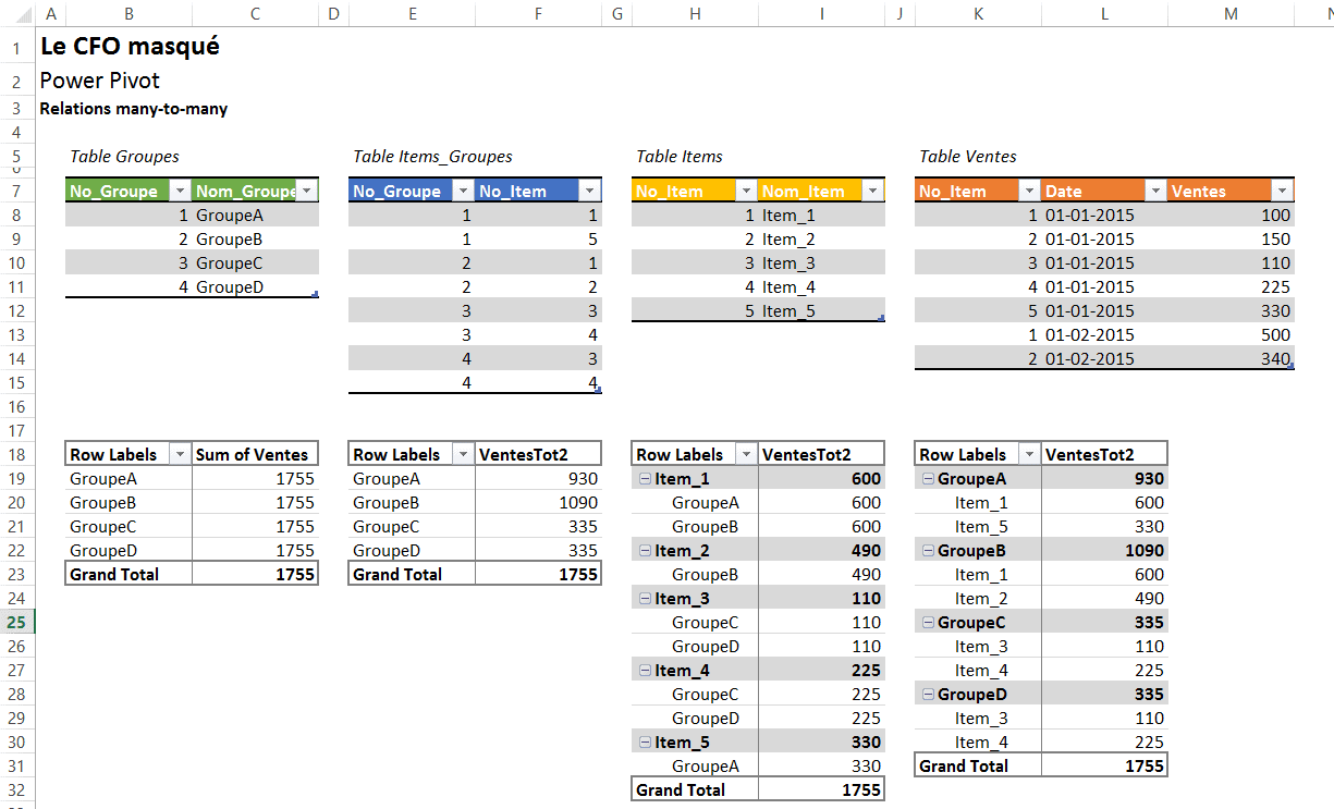 En supposant que vous avez 4 tables, tel qu’illustré ci-bas, dont une représente les ventes par date par numéro d’item (4ième table), une autre est une table de correspondance entre les numéros d’items et les noms d’items, une autre est une table de correspondance entre les numéros d’items et les numéros de groupes auxquels appartiennent ces items et finalement, la dernière table est une dernière est une table de correspondance entre les numéros de groupes et les noms de groupes. Vous noterez, dans le premier tableau croisé dynamique qui commence dans la cellule B18, qu’il est impossible de présenter les ventes par nom de groupe de façon directe. Le résultat présente toujours 1755, soit le total des ventes.