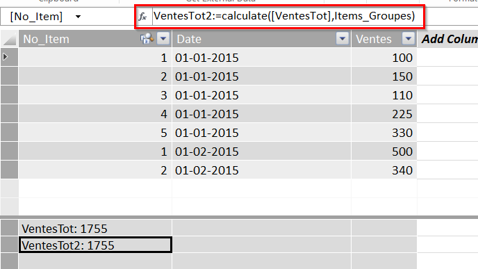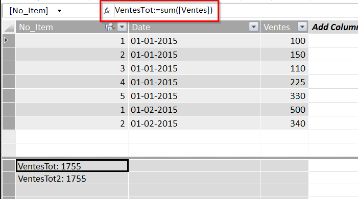 Ensuite, il nous faudra créer une mesure qui sera simplement le calcul des ventes totales, tel qu’illustré sur l’image ci-dessous.
