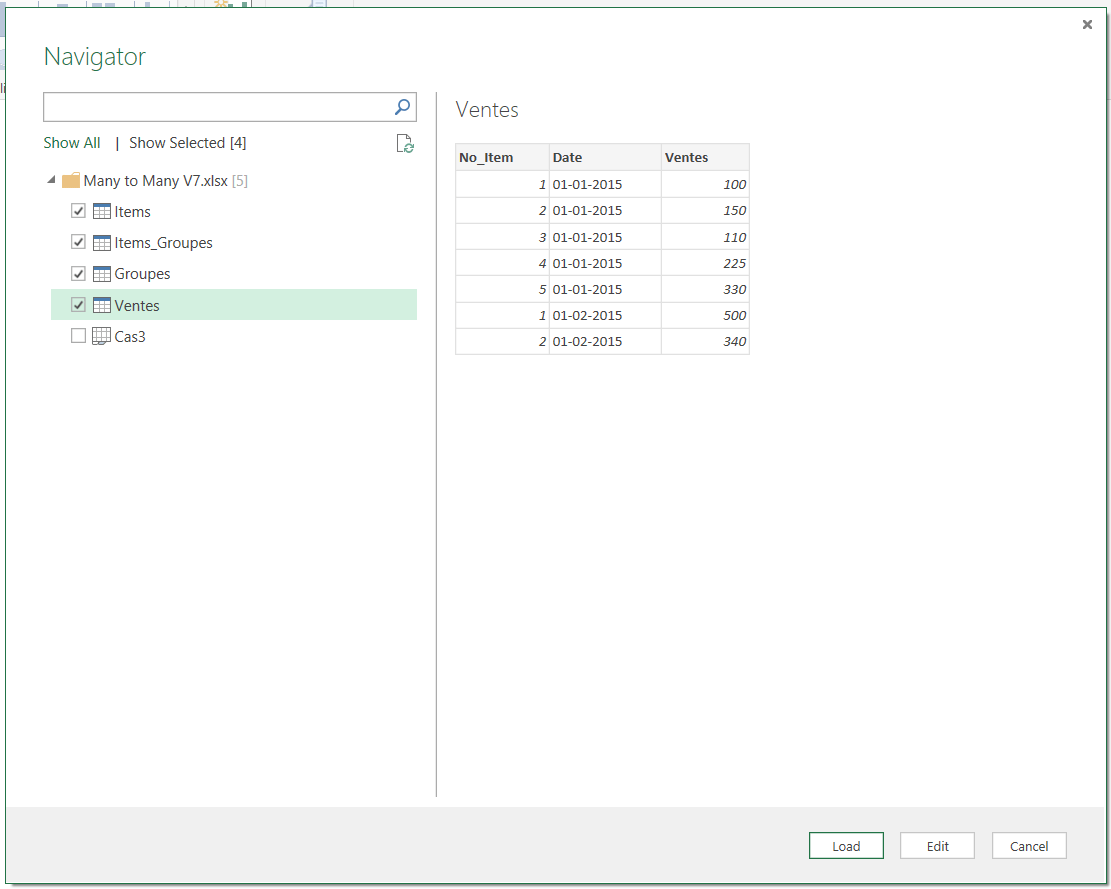 Dans notre exemple, il s’agit des tables Items, Items_Groupes, Groupes et Ventes, qui sont dans Excel. Nous pouvons cocher les 4 tables et elles seront chargées automatiquement dans le Power Bi Designer.