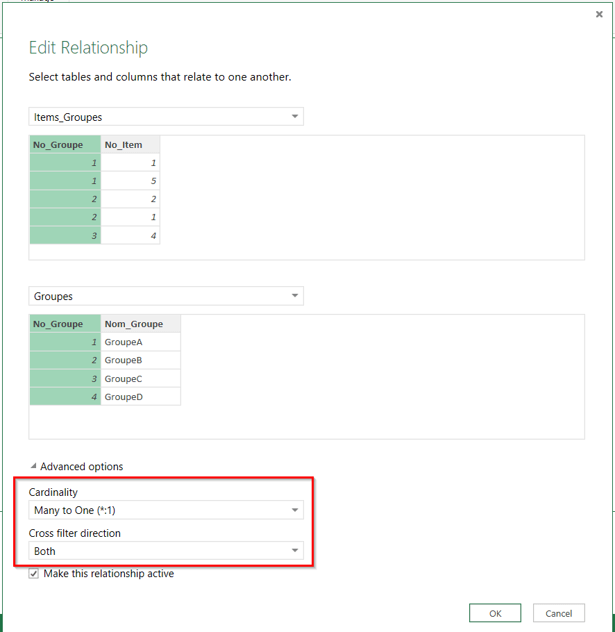 En cliquant sur le bouton “Edit” dans la boîte de dialogue précédente, nous obtenons une nouvelle fenêtre avec des options avancées dans le bas. En examinant ces options, nous remarquons qu’il est possible de créer des relations dans les 2 sens “Both” et que nous pouvons également choisir le type de relation.