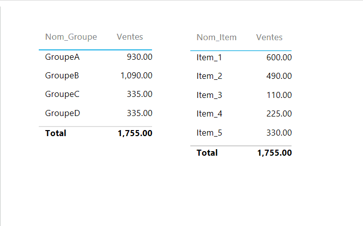 Ceci nous permettra d’abord de présenter correctement les ventes par groupe (voir le deuxième tableau croisé dynamique sur l’image suivante) et de présenter également les ventes par items par groupes (voir le troisième tableau croisé dynamique sur l’image suivante) et les ventes par groupes par items (voir le quatrième tableau croisé dynamique sur l’image suivante). Vous noterez que GroupeA=930, GroupeB=1090, GroupeC=335 et GroupeD=335 et donc que la somme de ces 4 groupes donne 1755 seulement si on tient compte que des items font partie de deux groupes, ce qui était le but visé.
