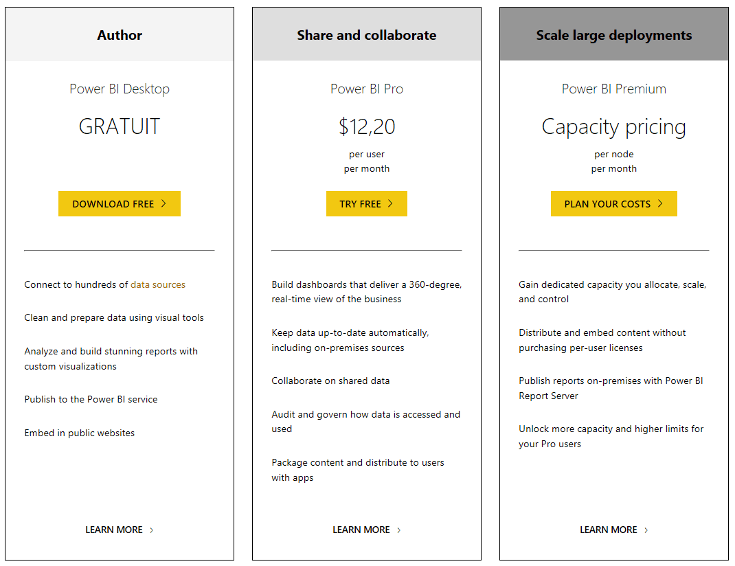 Hier, Microsoft a annoncé des changements à la tarification de son service web Power BI. Jusqu’à maintenant, nous pouvions utiliser, soit la version gratuite de Power BI Service, soit la version Pro à 9.99US$ par mois (12,20CAD$). Ces deux options sont encore disponibles mais la version gratuite a subi quelques ajustements. De plus, Microsoft a ajouté une troisième option, soit la licence Power BI Premium. Cet article vise à expliquer les principales différences entre ces 3 types de licences. À noter que les changements apportés à la version gratuite seront disponibles dès le 1er juin 2017 et que Power BI Premium sera disponible dans le deuxième trimestre de 2017 (vraisemblablement vers la fin du mois de juin 2017).