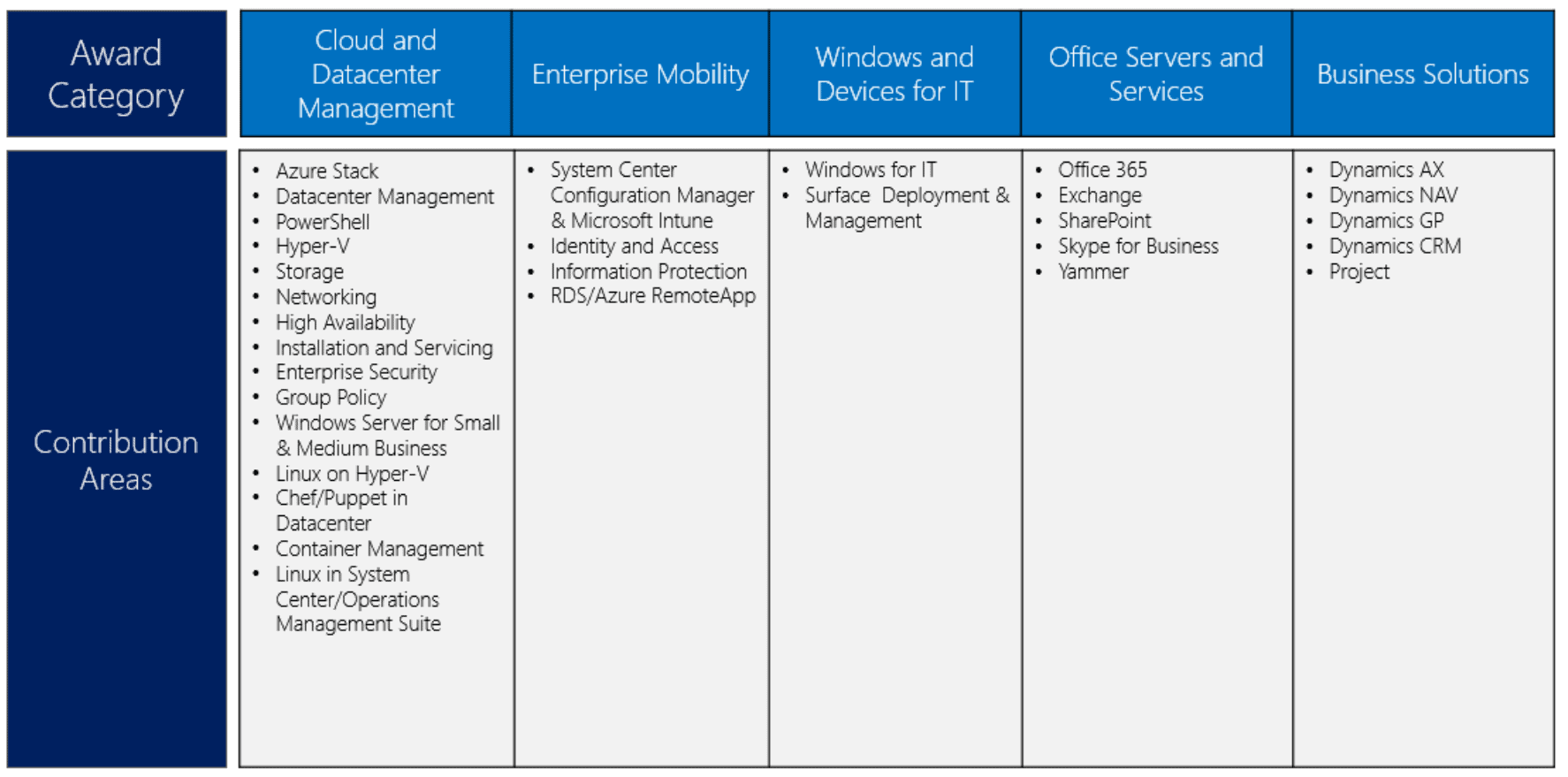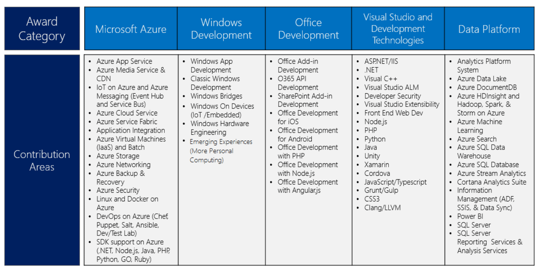 Microsoft a fait un peu de ménage dans son programme MVP en octobre dernier. Certaines catégories ont été maintenues. Il s’agit des catégories suivantes: