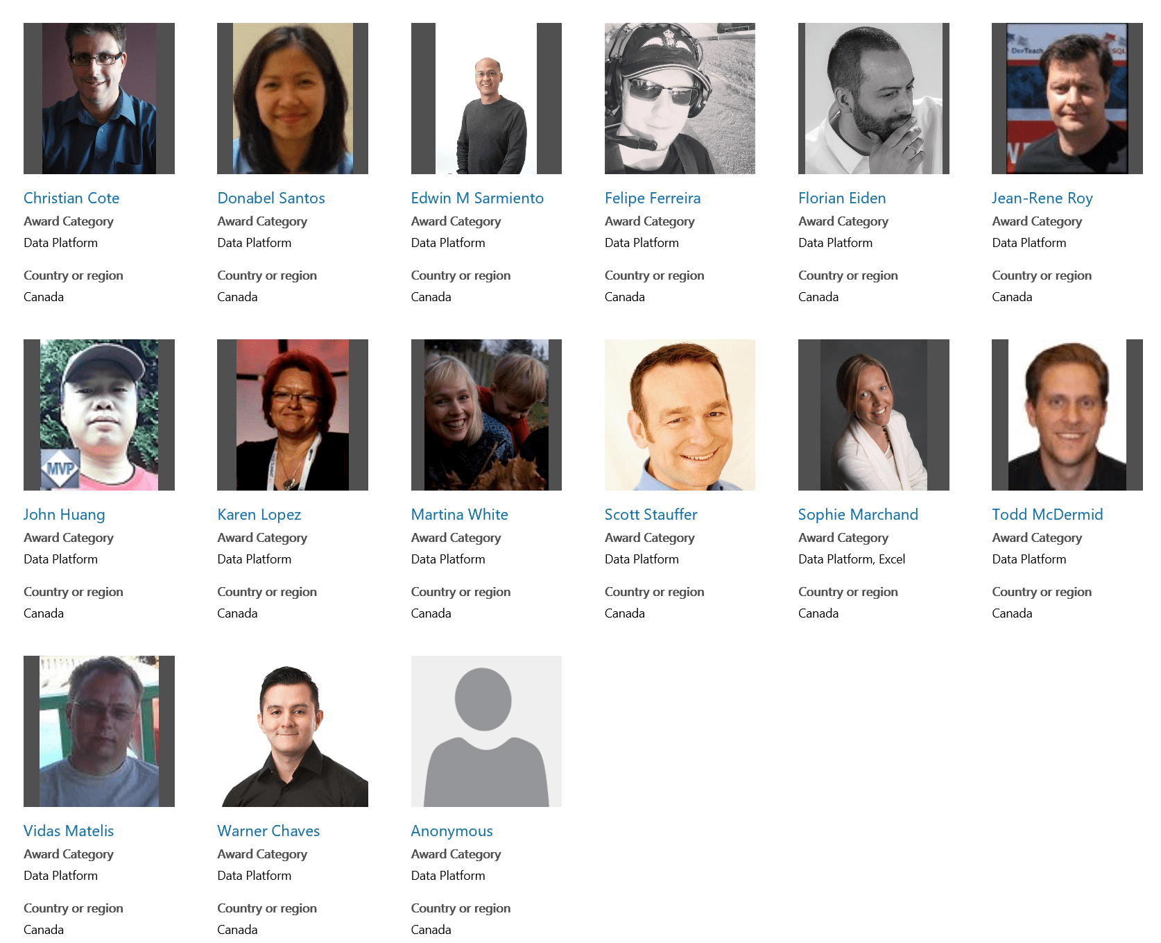 Au Canada toujours, nous sommes 15 MVP Data Platform. Ici, les compétences des différents MVP sont tout de même assez variées. Par exemple, mon ami Christian Côté, se spécialise davantage dans les produits comme SQL Server, SSIS, Analysis Services et Reporting Services, alors que je me spécialise davantage avec Power BI.