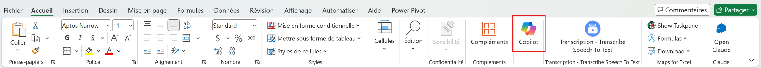 - Localisez et cliquez sur le bouton Copilot dans votre menu d’accueil dans Excel.