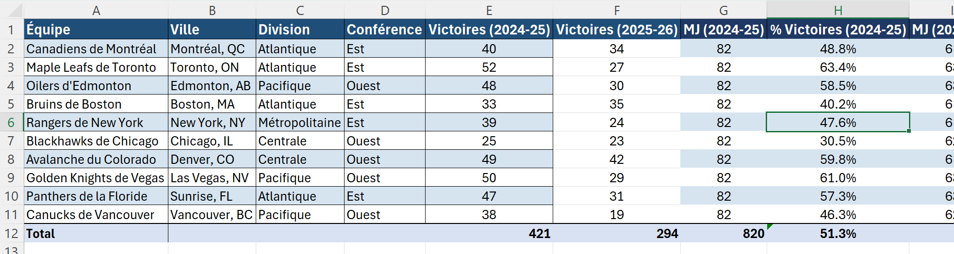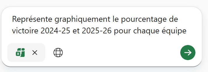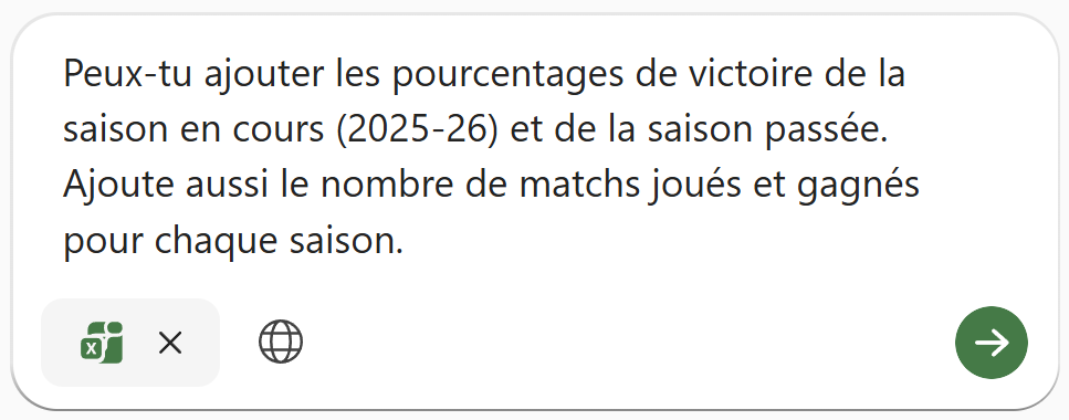 Copilot a compris ma demande et a ajouté plusieurs colonnes au tableau existant : Nombre de matchs joués, nombre de victoires et pourcentage de victoires pour chaque saison. Pour calculer le pourcentage de victoires, Copilot a inséré des formules dans ma table et ce, sans que j’aie eu à lui demander.