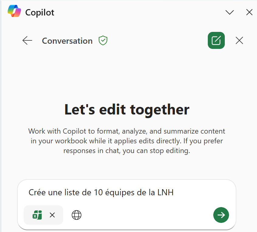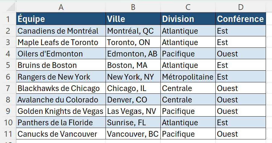 À partir d’un classeur vide, j’ai demandé à Copilot de créer une liste de 10 équipes de la LNH.
