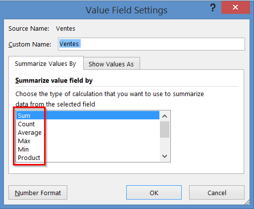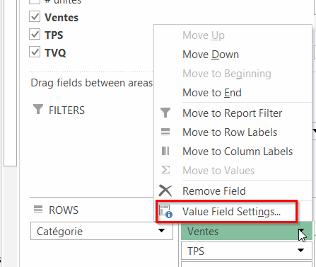 Pour changer une valeur de nombre à somme ou pour tout autre changement, vous devez vous rendre dans les paramètres de champs de valeurs (Value Field Settings).