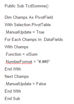 Il n’existe aucune façon dans Excel de changer l’ensemble des valeurs d’un tableau croisé dynamique en une somme ou en une autre opération, d’un seul coup. Pour accomplir une telle tâche, on doit nécessairement utiliser le code VBA que voici: