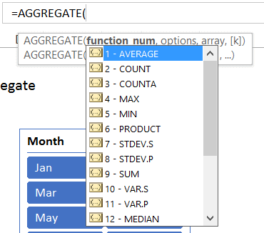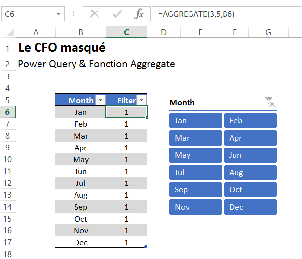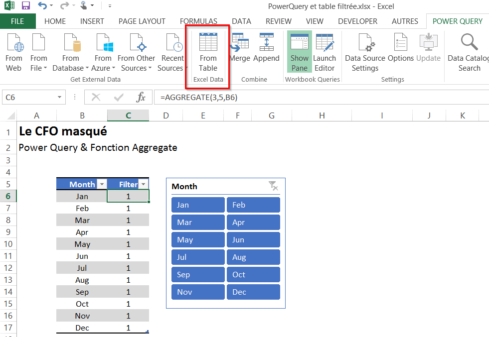 Si vous n’avez pas encore eu la chance d’utiliser la fonction Agregat (ou Aggregate en anglais), je vous invite d’abord à relire l’article suivant: Excel 2010: La nouvelle fonction Aggregate (Agregat). Pour passer des paramètres dans Power Query via un segment (slicer), vous pouvez d’abord créer une table (mise sous forme de tableau) dans Excel avec une colonne qui comprend le paramètre que vous souhaitez utiliser et une colonne avec une fonction Agregat (ou Aggregate en anglais), qui permet de rapporter le nombre de cellules non vides (représenté par le 3 dans la fonction) lorsqu’une ligne n’est pas cachée (représenté par le 5 dans la fonction).