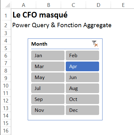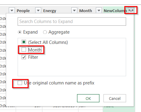 Une fois la fusion effectuée, ne reste plus qu’à ouvrir le menu d’expansion et de décocher la case Month pour ne retenir que la colonne Filter. C’est cette colonne qui nous permettra de filtrer la requête Power Query via le segment (ou slicer) dans Excel. Remarquez également que vous pouvez décocher l’option Use original column name as prefix pour éviter d’avoir à renommer votre colonne.