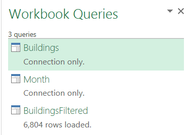 - BuildingsFiltered (fusion des 2 tables précédentes) chargée dans la feuille Excel
