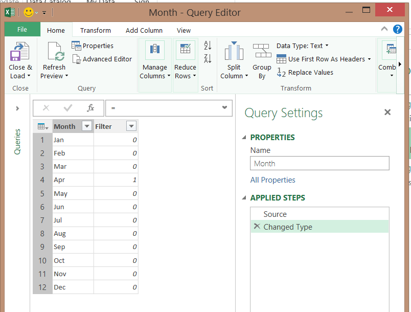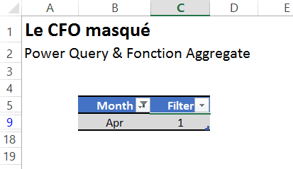 Ainsi, quand un usager clique sur le segment Avril, la table Excel (mise sous forme de tableau) est filtrée sur le mois d’avril et la colonne 1 rapporte un 1 alors que toutes les lignes cachées rapportent 0. Vous ne pouvez pas le voir puisqu’elles sont cachées! Toutefois, comme vous avez lié cette table à Power Query, vous pouvez voir le résultat dans Power Query. Pour cela, il faut bien sûr d’abord actualiser la requête.