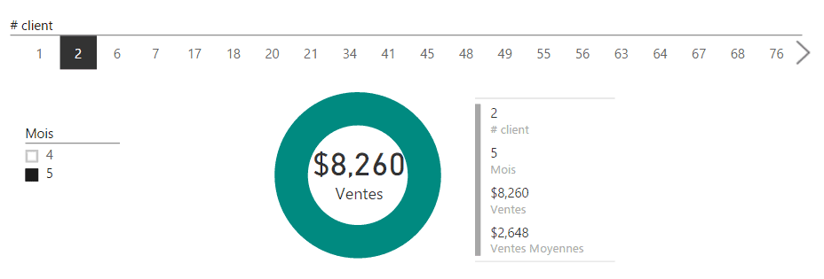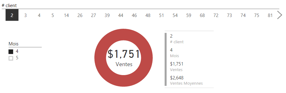 Le premier graphique consiste en un anneau rouge, jaune ou vert, selon son état, qui présente certaines données, ici des données de ventes, pour un client donné et un mois donné.