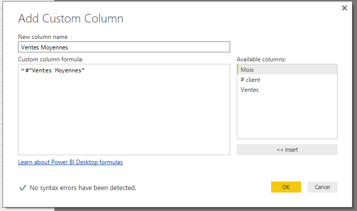 J’ai, par la suite, ajouté une colonne personnalisée pour créer une colonne Ventes Moyennes dans ma table.