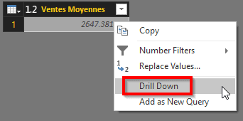 Et j’ai cliqué sur “Drill Down” (ou forer) pour isoler le résultat dans mes étapes de transformation.