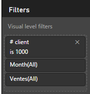 J’ai ensuite ajouté des slicers (segments), ce qui a permis de présenter un cercle unicolore, rouge, jaune vert puisque les données ne sont que pour un seul client et un seul mois donc le KPI ne peut être à la fois 1 et -1, par exemple.