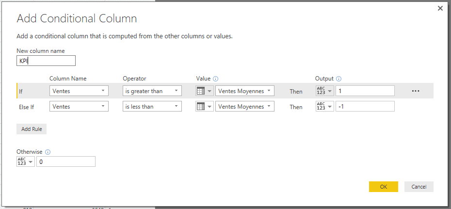 J’ai ensuite ajouté une colonne conditionnelle (une fonctionnalité ajoutée récemment dans Power BI Desktop) et j’en ai fait une colonne de KPI, de sorte que toutes les ventes sous la moyenne présentent -1, toutes les ventes au-dessus de la moyenne présentent 1 et celles égales à la moyenne présentent 0.