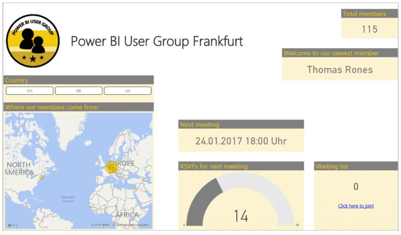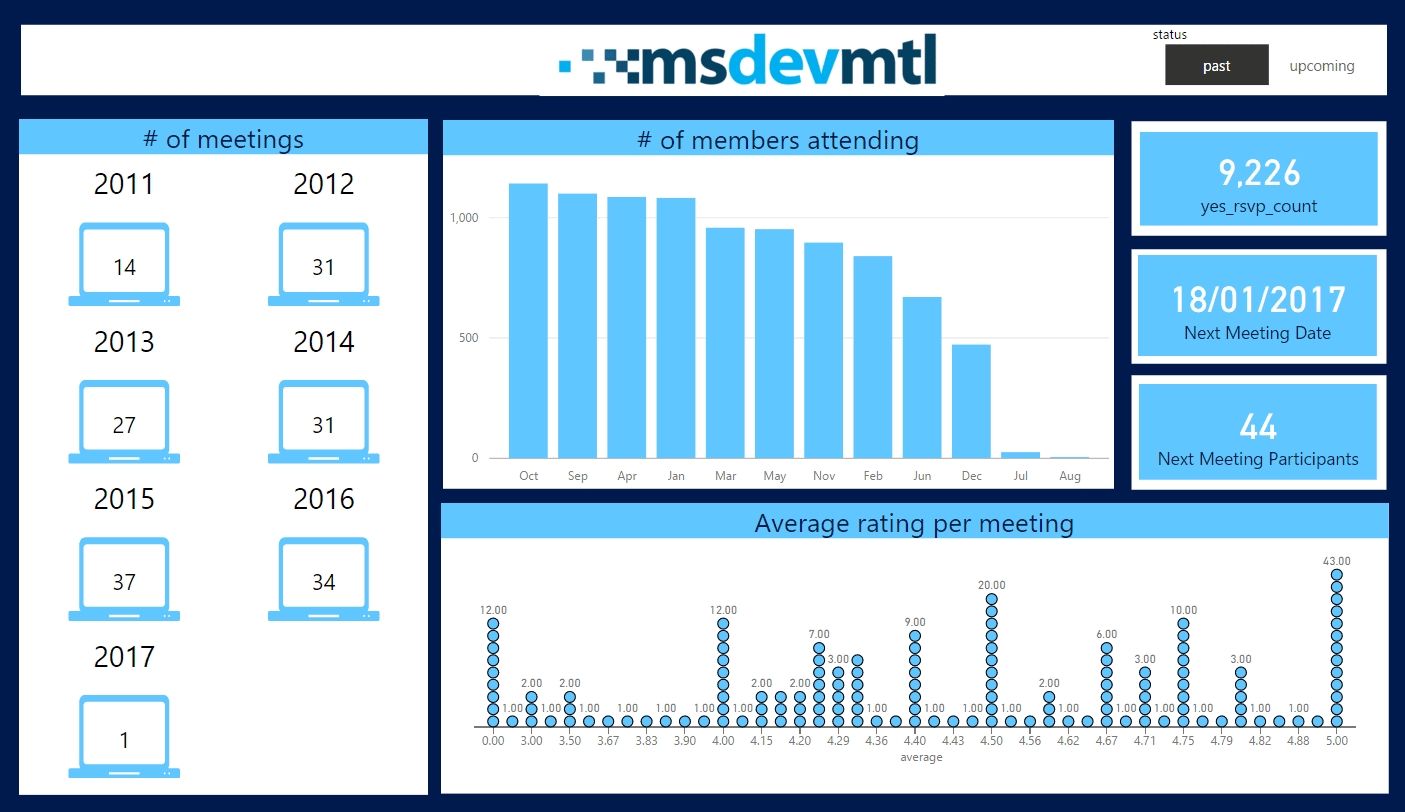 Pour récupérer le modèle Power BI pour les groupes Meetup, vous pouvez vous rendre sur la page Power BI 12 Days of Dashboards – Day 6 – Meetup.com Dashboard.