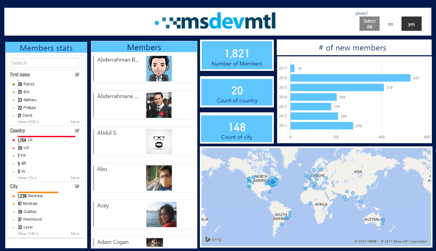 Pour chacun des modèles que j’ai testés, Pinterest, LinkedIn et Meetup, j’ai dû ajuster les requêtes car elles ne fonctionnaient pas très bien avec mes données. Le modèle de Meetup utilise l’API Meetup pour aller récupérer ses données. Dans ce modèle, j’ai dû retravailler considérablement les données de mes colonnes de dates, afin qu’elles soient reconnues (l’auteur n’avait pas pensé à couvrir les cas où les usagers utilisent des paramètres régionaux différents). J’ai également constaté que du côté de l’importation des membres du groupe Meetup, la requête n’allait chercher que les données de la page 1, donc les membres dont le nom de famille débutent par la lettre A, dans le cas du groupe Meetup MSDEVMTL, qui possède beaucoup de membres. J’en ai fait part à l’auteur, qui, comme vous pouvez le voir sur le blogue de Microsoft, ne reconnaît pas cette erreur puisque tout fonctionne bien avec ses données à lui. La raison pour laquelle tout fonctionne bien avec ses données, c’est qu’il a seulement 130 membres dans son groupe (donc une seule page de membres). Dans mon groupe Meetup, i.e. celui de la communauté MSDEVMTL, nous avons plus de 2200 membres et le problème est donc très réel.