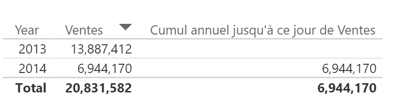 Dans mon exemple, j’ai des ventes sur une année complète en 2013 et jusqu’au mois de juin en 2014. Voici le résultat dans un tableau qui présente le cumul par année: