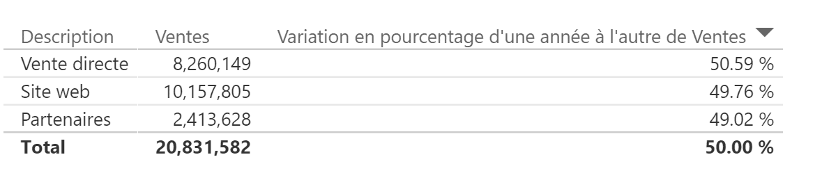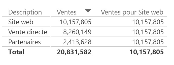 Voici maintenant le résultat dans un tableau. On voit que cette mesure présente les ventes réalisées sur le site web, peu importe le canal de ventes placé dans les étiquettes de lignes.