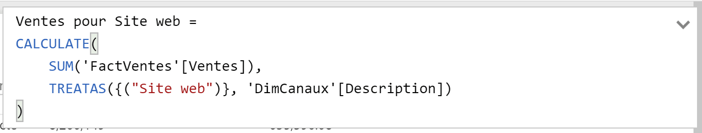Ci-dessous, je calcule une mesure filtrée, qui représente les ventes pour le canal de ventes, site web.