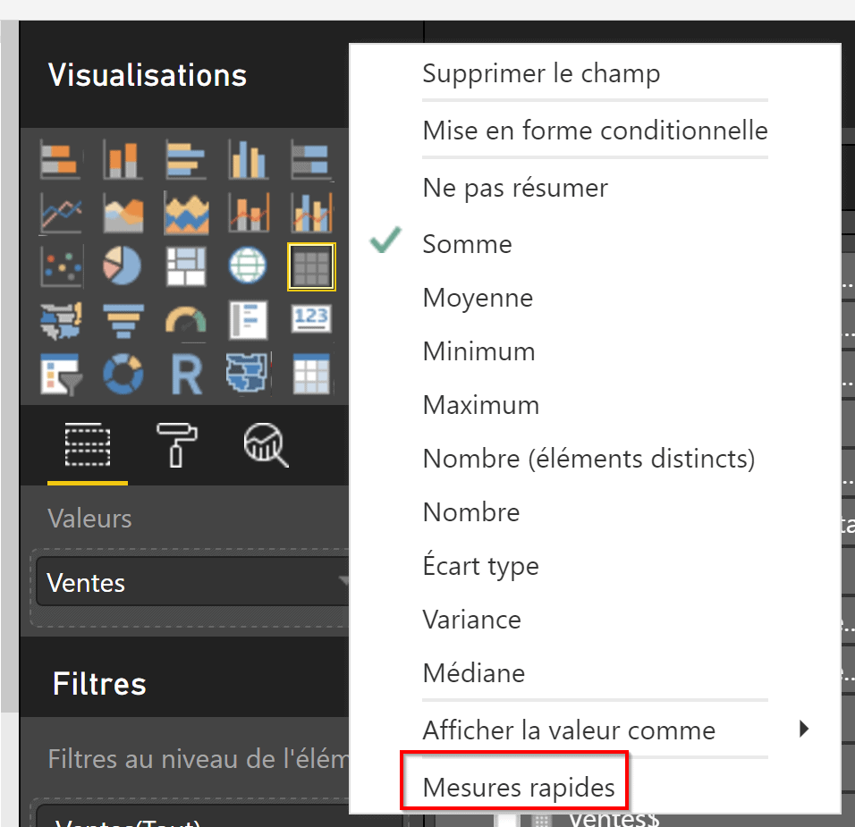 Pour accéder au menu de mesures rapides, placez simplement un champ de valeur dans le panneau des champs de valeurs et cliquez sur le bouton droit de votre souris. Vous trouverez l’option de mesures rapides, tout au bas de la liste.