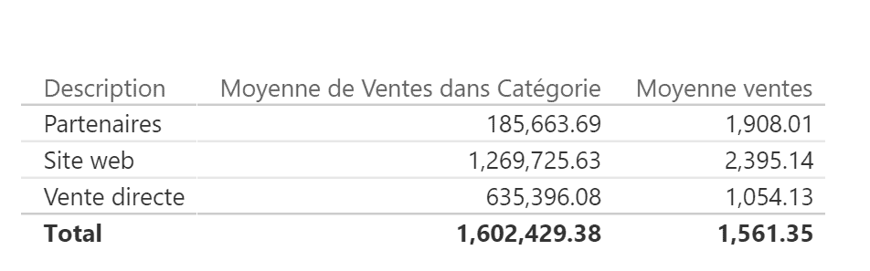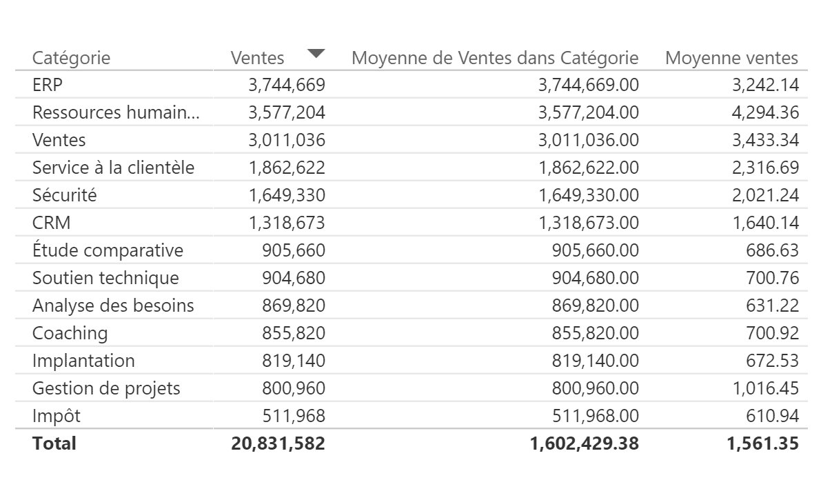 Voici un bon exemple de mesure rapide qui pourrait être mal utilisée. Dans le tableau ci-dessous, j’ai placé les ventes, la moyenne de ventes dans catégorie (soit la mesure rapide calculée ci-dessus) et la moyenne des ventes, par catégorie de produits. Prenez le temps de comparer les résultats:
