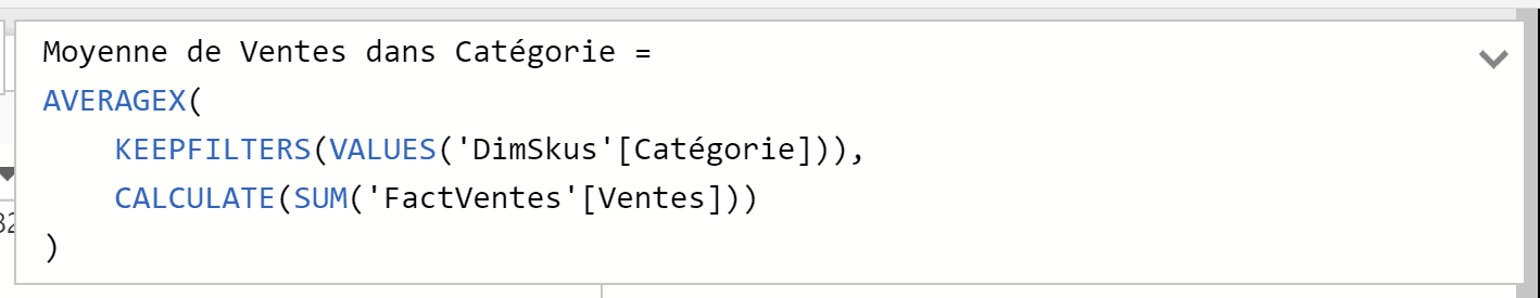 Ainsi, vous comprenez bien que la moyenne d’une valeur dans la catégorie x n’est pas équivalente à la moyenne de cette valeur. La formule DAX sous-jacente n’est pas la même non plus. Dans le premier cas, on utilise la fonction KEEPFILTERS, qui modifie la façon dont les filtres sont appliqués lors de l’évaluation d’une fonction CALCULATE. Ce genre de détail est important et peut induire en erreur un débutant.