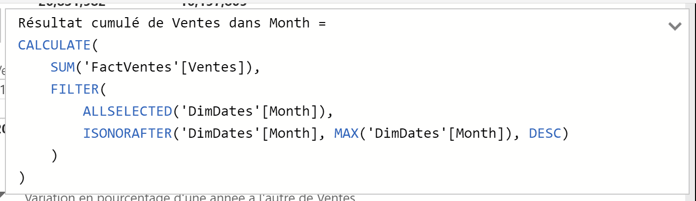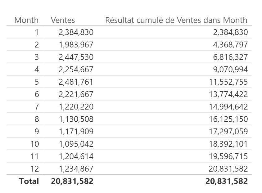 Ci-dessous, je calcule le résultat cumulé des ventes par mois: