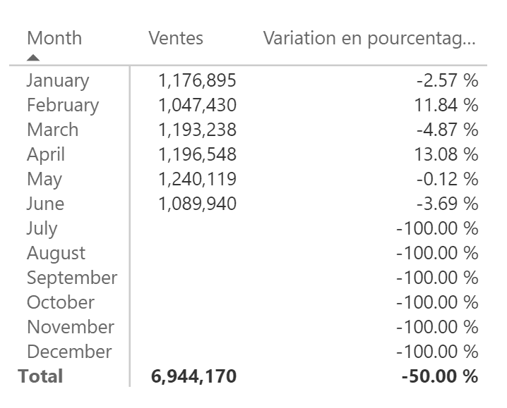 Voici le résultat dans un tableau présentant les ventes par mois: