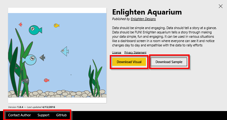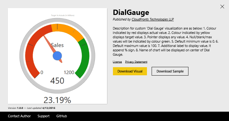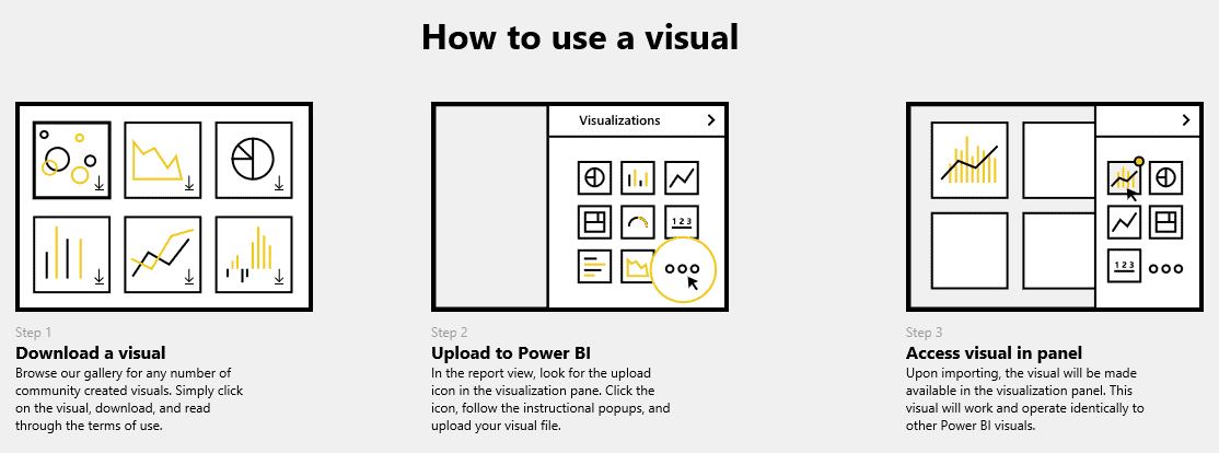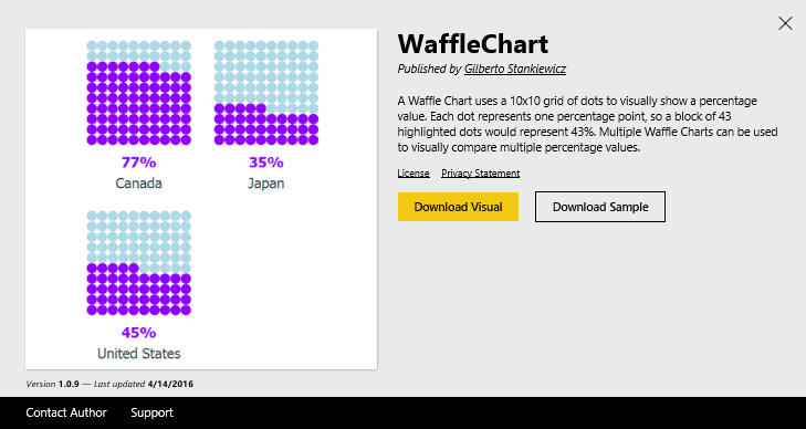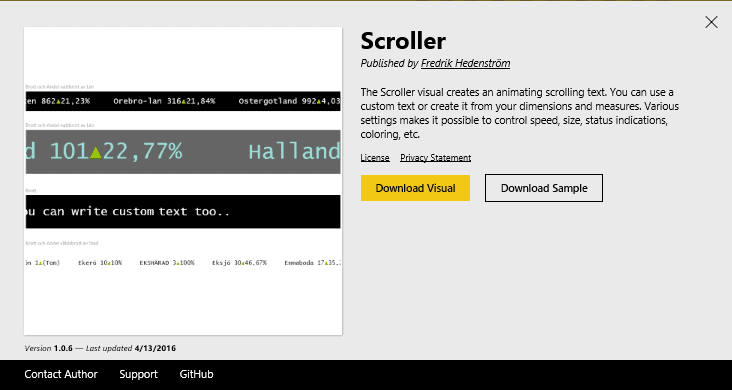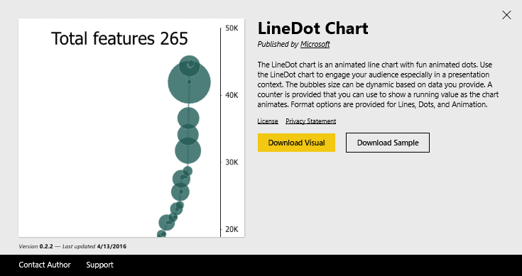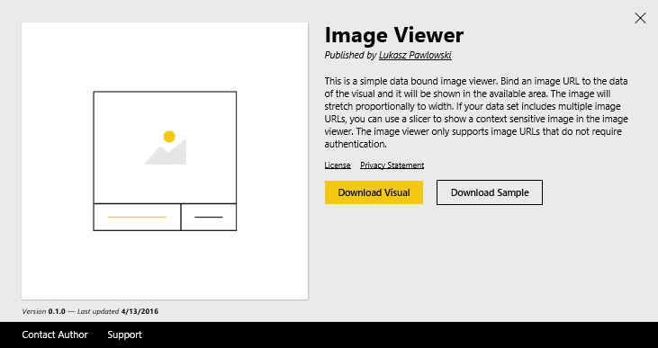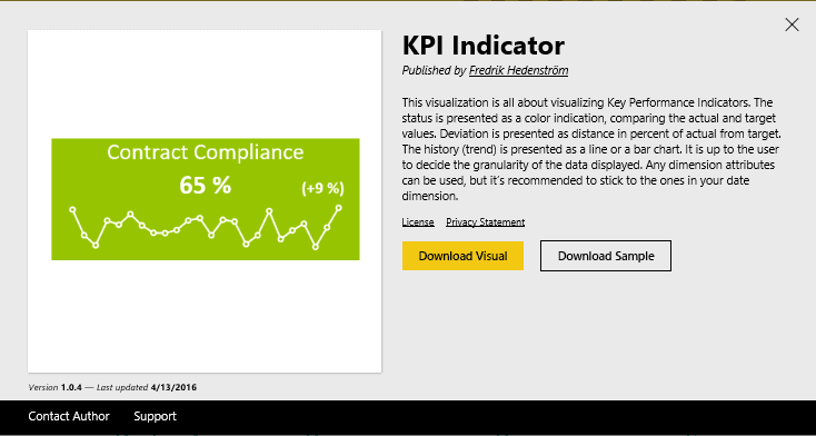 D’abord, lorsque vous cliquez sur un élément visuel, une boîte de dialogue s’ouvre. Vous pouvez télécharger un fichier .pbix avec des exemples d’utilisation de cet élément et vous pouvez également consulter une page d’aide. Enfin, vous pouvez télécharger l’élément visuel et l’enregistrer sur votre ordinateur.