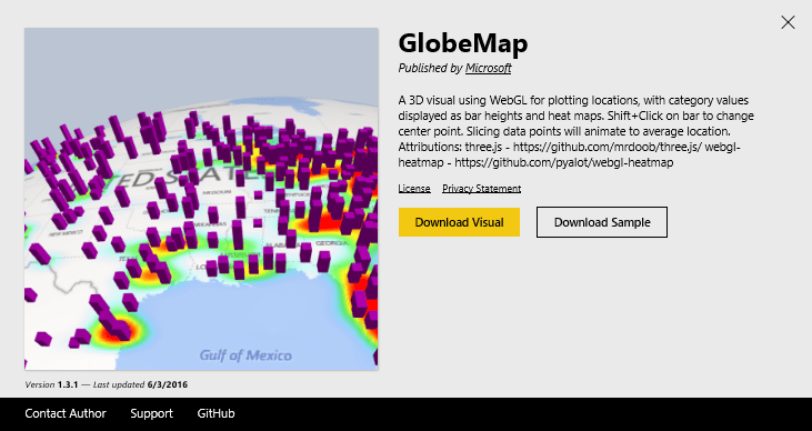 Il est impossible d’importer du Power Map /3D Maps dans Power BI. Il peut donc s’avérer intéressant d’utiliser l’élément visuel “GlobeMap”. Celui-ci possède moins de fonctionnalités que Power Map / 3D Map mais demeure fort intéressant.