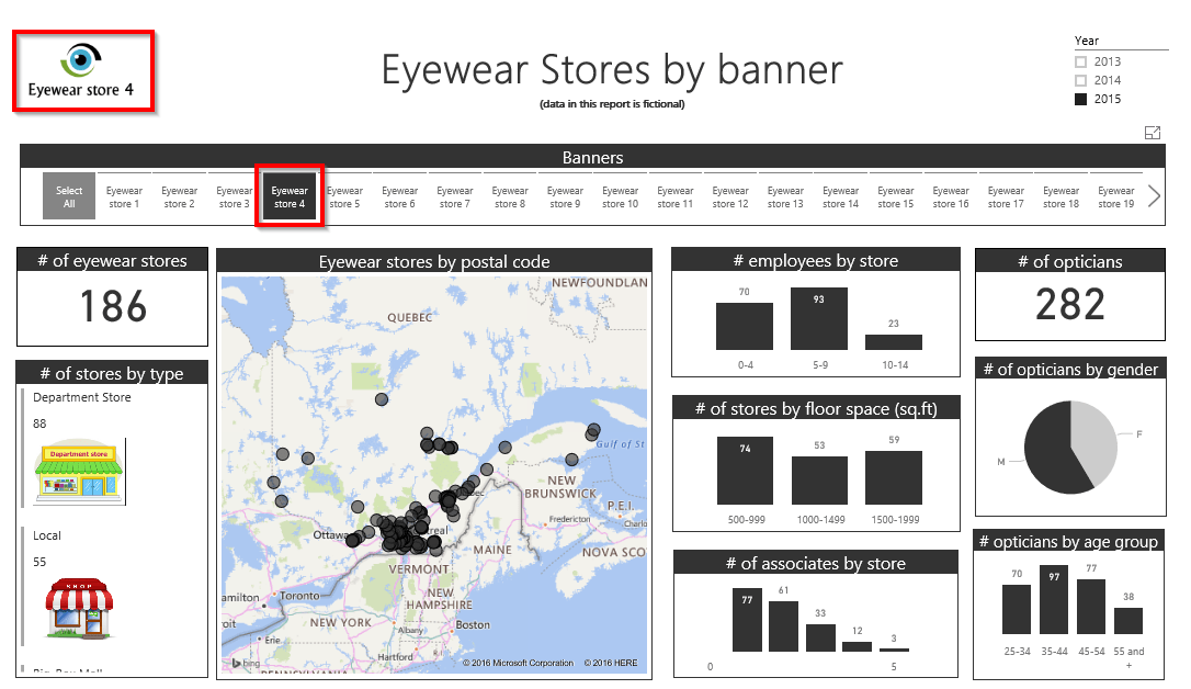 J’aime beaucoup cet élément visuel. Il permet, facilement, d’afficher une image en cliquant sur un élément. Par exemple, dans le rapport Eyewear Stores by banner (deuxième rapport dans la page), lorsque l’on clique sur un nom de bannière, on voit son logo apparaître dans le haut. C’est possible grâce au Image Viewer.