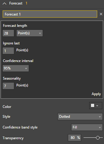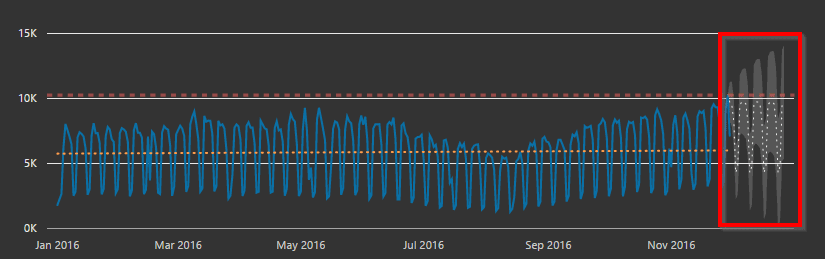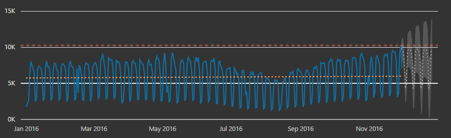 J’ai finalement ajouté une courbe de prévision (courbe blanche en pointillés). J’ai demandé un horizon de prévision de 28 jours (soit 4 semaines). J’ai demandé d’ignorer le dernier jour puisque les données du dernier jour ne sont jamais complètes lors de l’analyse. J’ai aussi préciser que mes données avaient une saisonnalité de 7 points (7 jours).