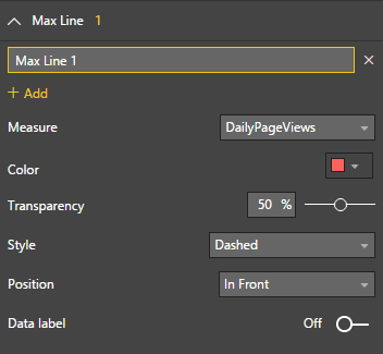 J’ai également ajouté une ligne pour indiquer la valeur maximale atteinte (courbe rouge avec tirets). Ceci me permet de voir chaque jour l’écart entre le nombre de pages vues du jour et le nombre de pages vues de la meilleure journée à date. Là aussi, quelques options analytiques de personnalisation sont disponibles: