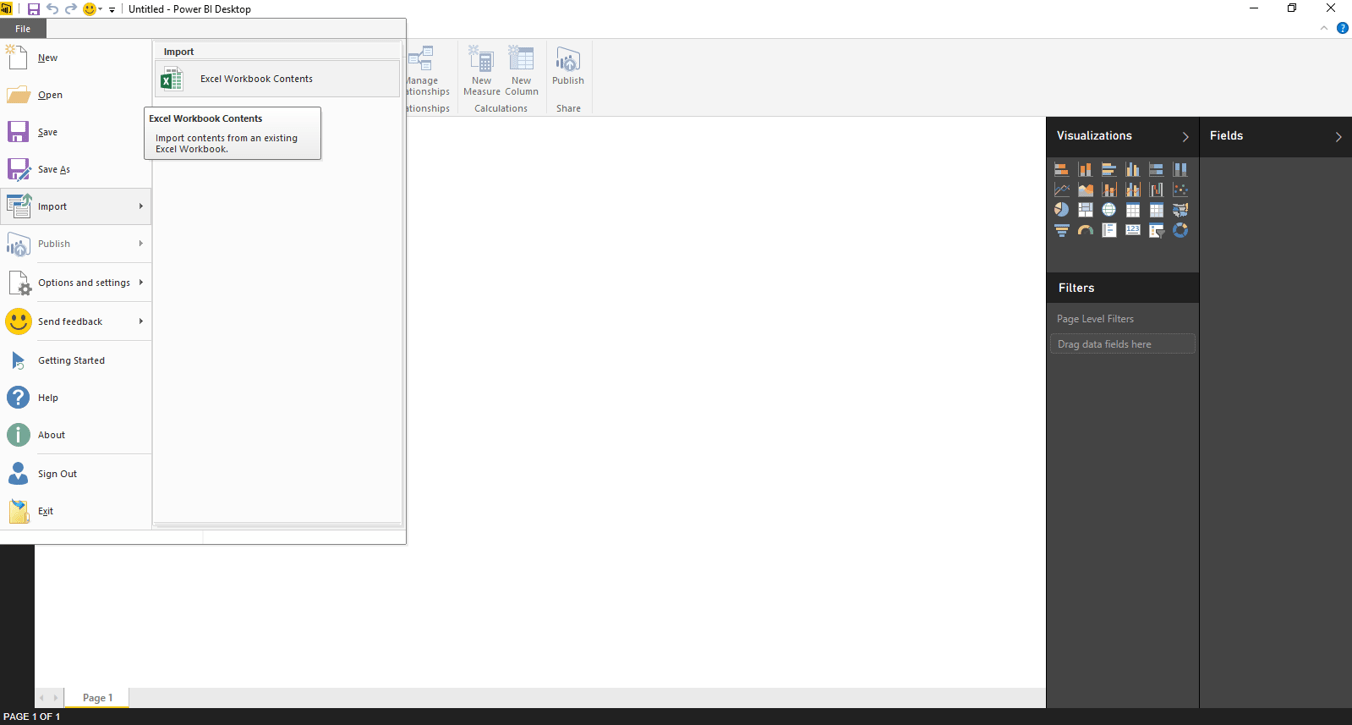 Pour importer un fichier Excel dans Power BI Desktop, rendez-vous dans le menu File et choisissez ensuite l’option Import, puis Excel Workbook Contents.