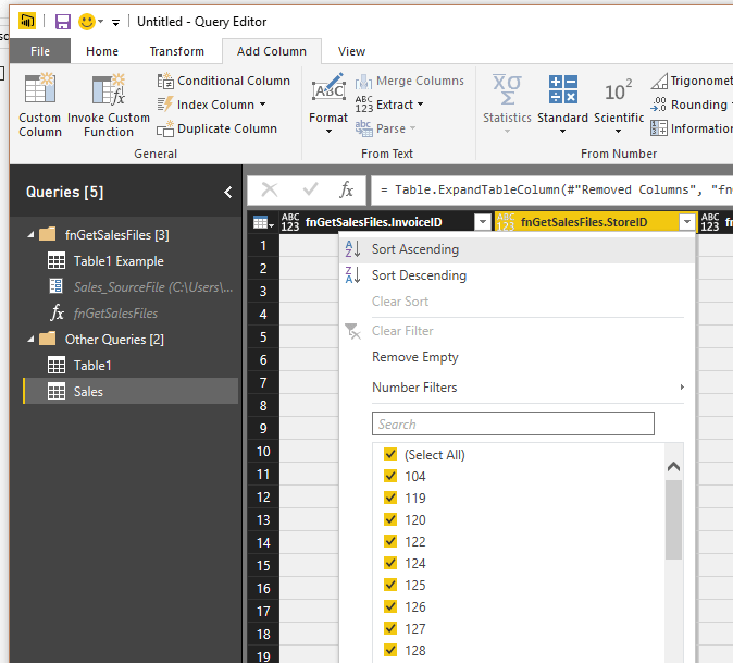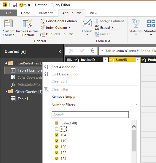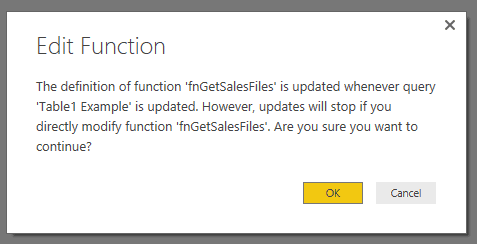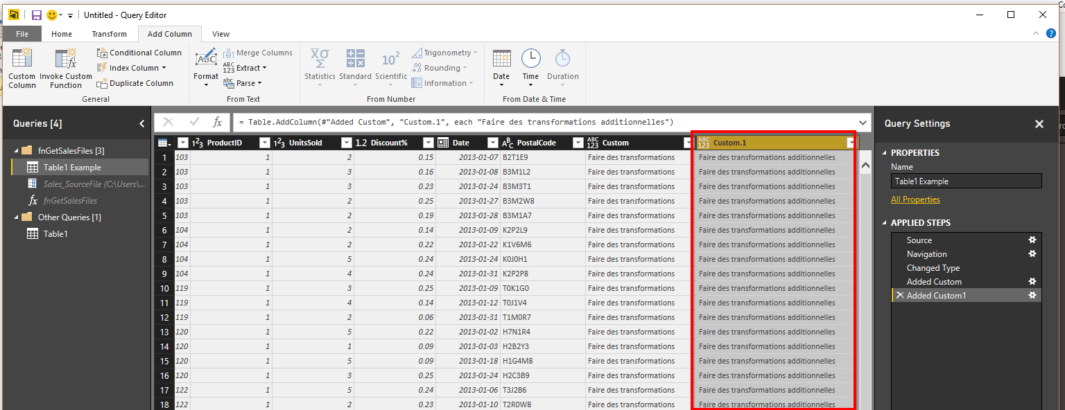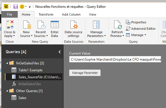 Avec l’ancienne façon de procéder, il n’était pas possible de voir toutes les étapes de transformation d’une fonction, dans le menu d’édition de requêtes. Pour les voir, il fallait aller dans le code et remplacer les paramètres par de vraies valeurs et retirer les éléments du code qui convertissait la requête en fonction. C’était, avouons-le, utile mais désagréable. À présent, il est possible d’accéder à une requête “exemple” sous-jacente à la fonction et de modifier la fonction à partir de cette requête, tel qu’illustré dans cet article.