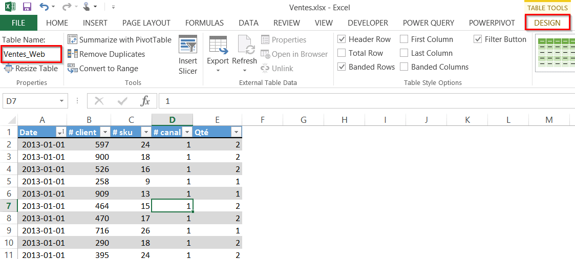 D’abord, j’aime travailler avec des bases de données qui ont des noms significatifs. Cela rend les transformations plus faciles. Par exemple, si vos données d’origine sont dans une table Excel, je recommande de nommer d’abord la table Excel avec un nom siginificatif, comme Ventes_Web ci-bas. Ainsi, lorsque vous vous connecterez à ce fichier, qui possède plusieurs tables, vous saurez immédiament laquelle de ces tables vous intéresse.