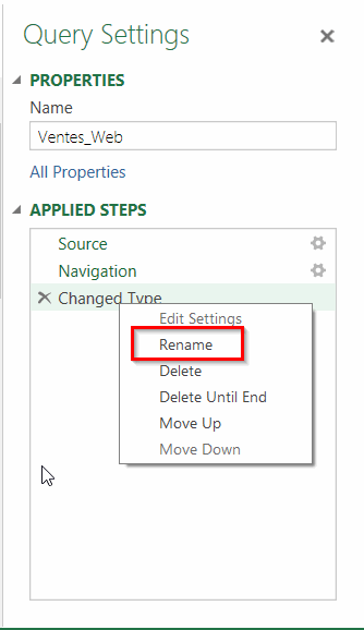 Il peut s’avérer plus facile de donner des noms significatfs aux étapes de transformation, surtout si plusieurs usagers doivent travailler avec les requêtes et les comprendre individuellement. Pour cela, il s’agit de faire un clic droit de souris sur une étape de transformation et lui donner un nom approprié. Là encore, en observant cette meilleure pratique dans Power Query, j’améliore largement ma navigation dans la solution.