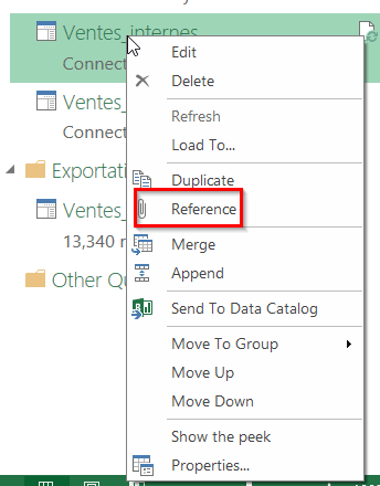Au moment où j’écris cet article, lorsque l’on fait une référence à une autre requête, Power Query enregistre automatiquement la requête dans le fichier Excel (ce n’est pas ce que l’on souhaite). Vous devez donc cliquer sur le bouton de droite sur votre nouvelle requête et décocher l’option “enregistrer dans le fichier Excel” et cocher plutôt l’option “enregistrer la requête dans le modèle de données” Power Pivot.