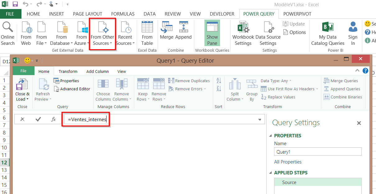 Cela dit, une autre option est possible. C’est celle que j’utilise. Vous pouvez simplement vous rendre dans la section des sources de données de Power Query et choisir l’option “From Other Sources”. Ensuite, vous écrivez simplement =nomdelarequête et vous êtes libre d’enregistrer le tout directement dans le modèle de données Power Pivot.